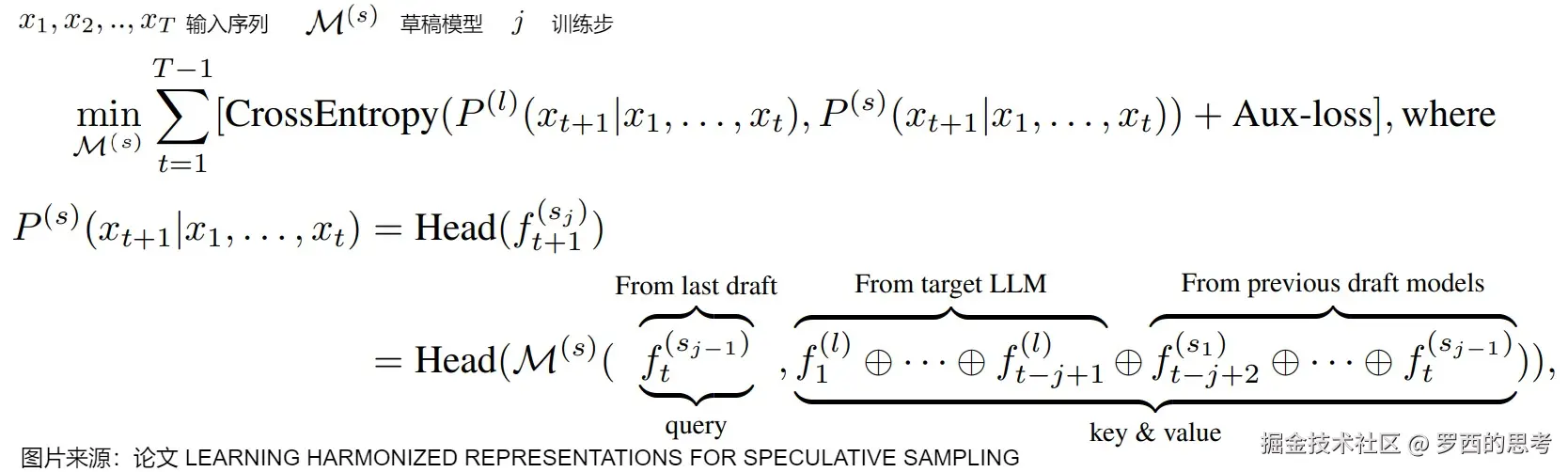 q 和 p 分别表示目标 LLM 和草稿模型预测下一个词的条件概率分布。在结合 EAGLE 时,训练阶段可以从目标 LLM 的 hidden states 中获取,这意味着结合 Top-K 损失训练有着和 EAGLE 一样的训练效率。
