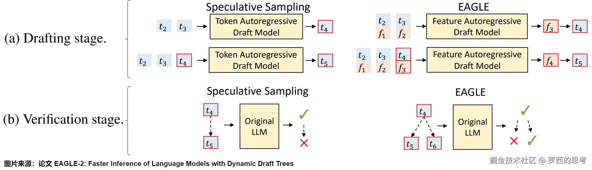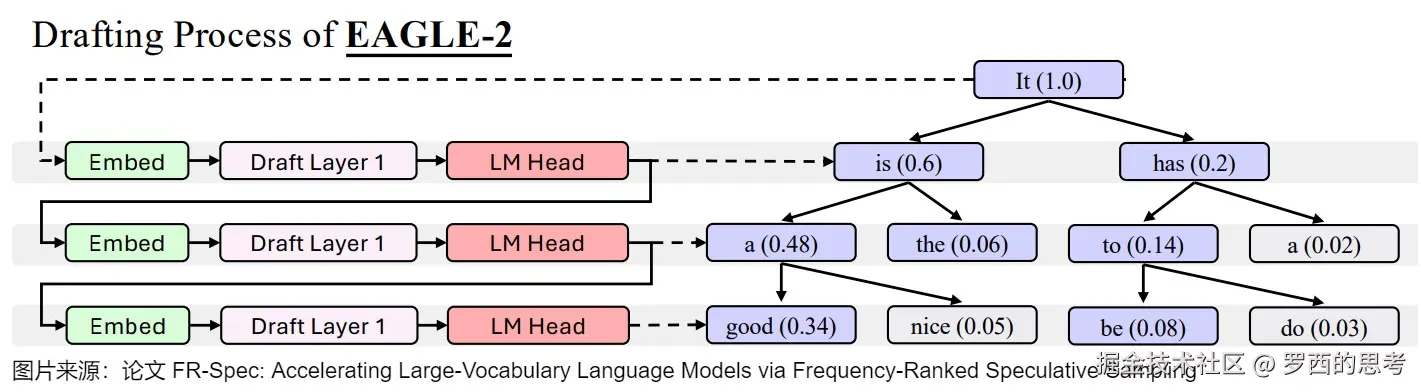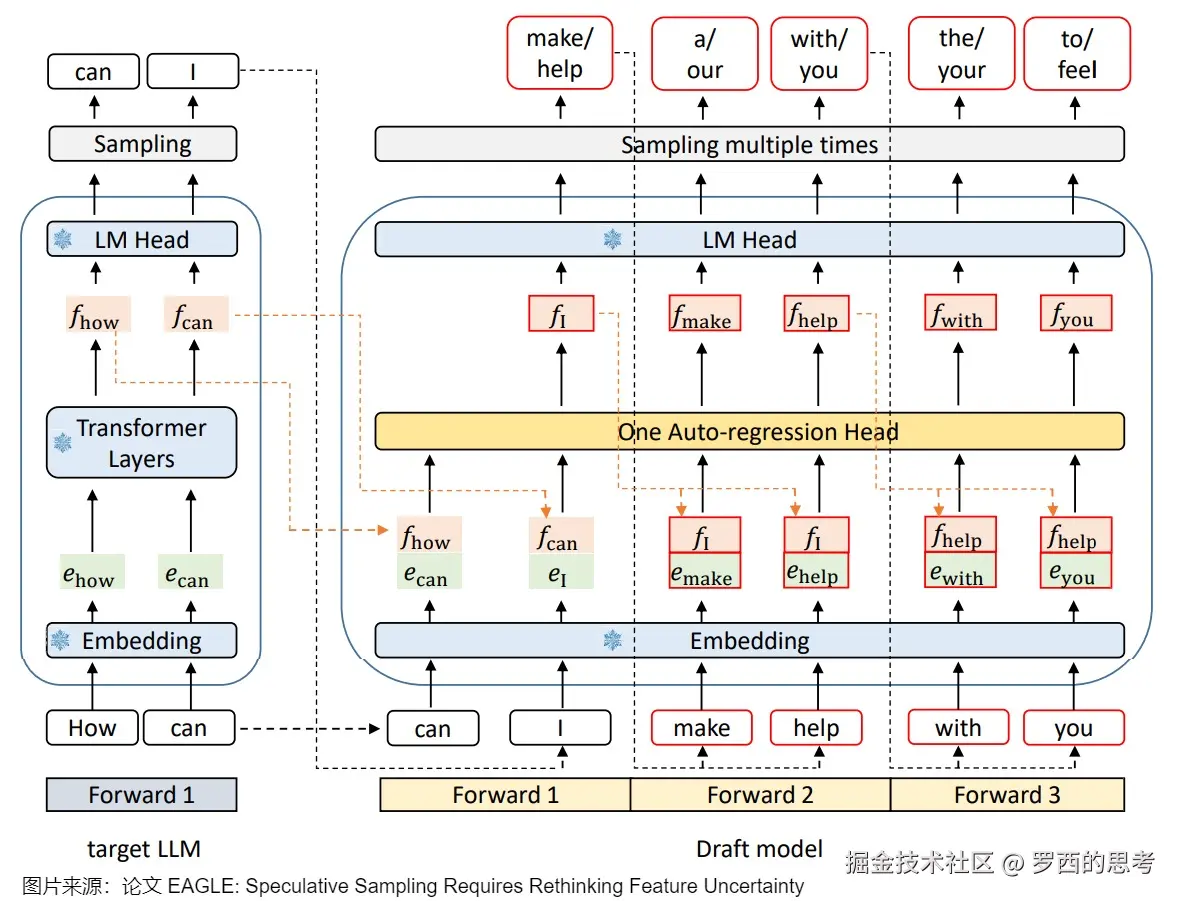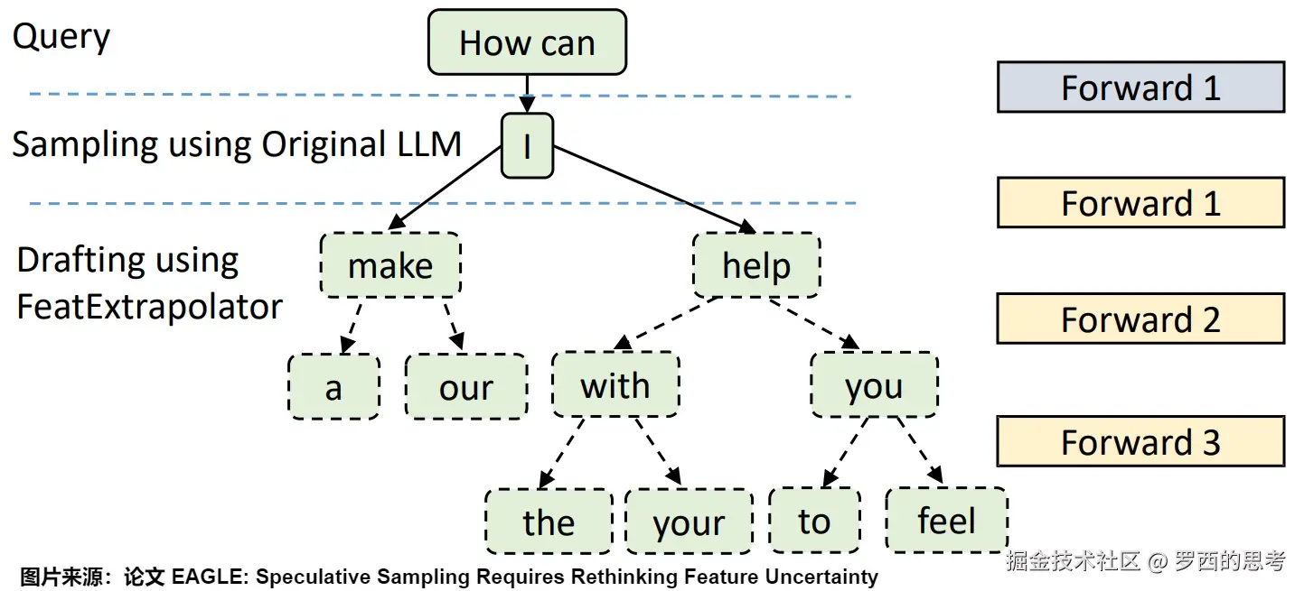 因为第一次前向传播无法加速,所以需要通过一次前向传播才能得到后续 EAGLE 所需要的特征。这里也就能看出上面对比图中,EAGLE 为何要从 画起。