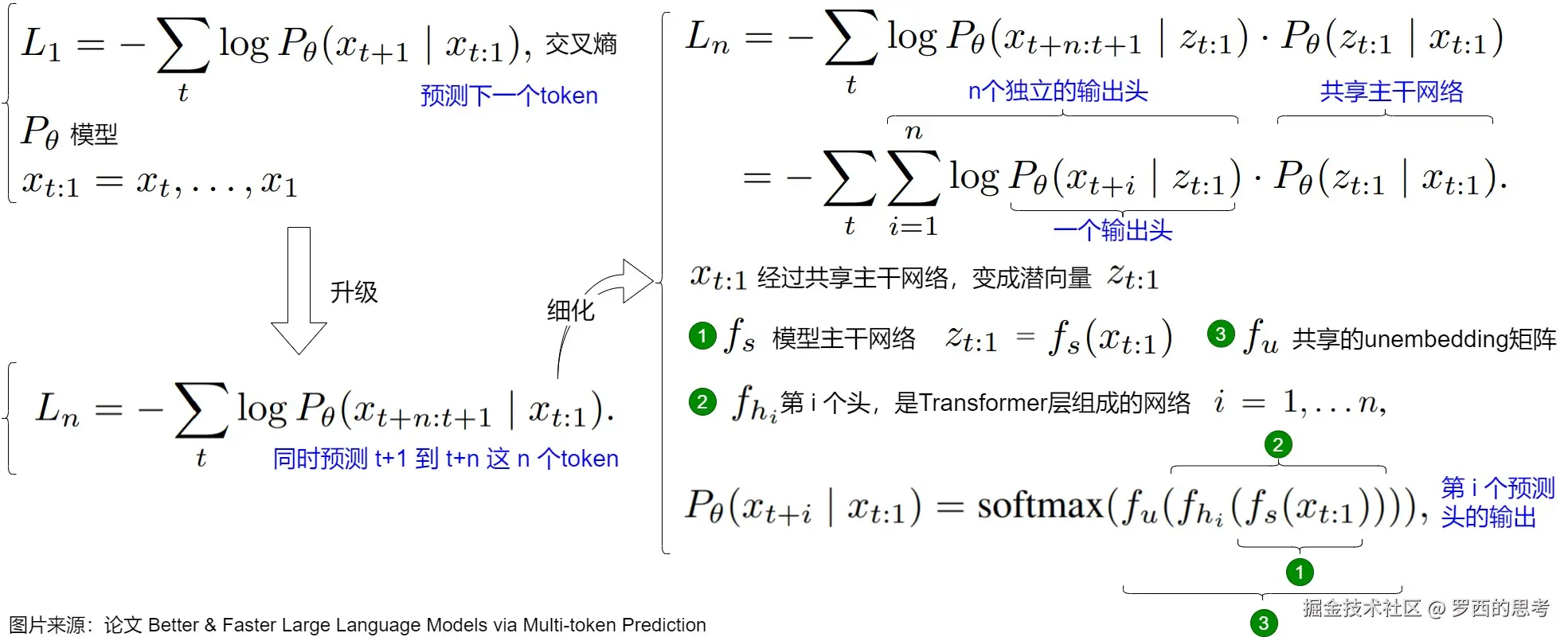 论文“Better & Faster Large Language Models via Multi-token Prediction”的核心思路是,让模型在训练时,一次性预测多个未来token,而不是仅仅预测下一个token。