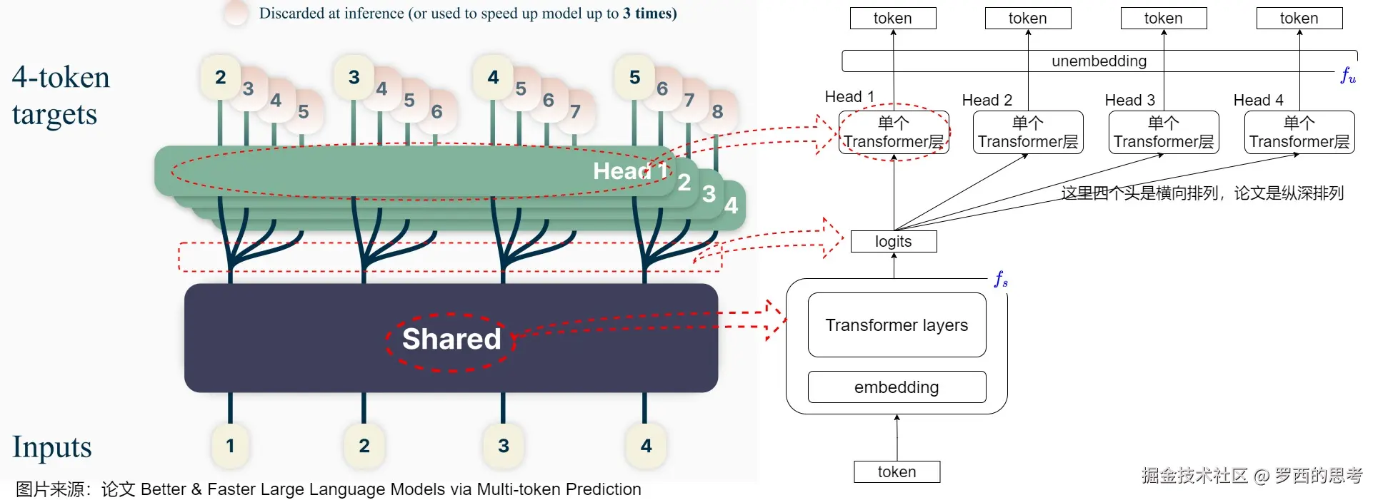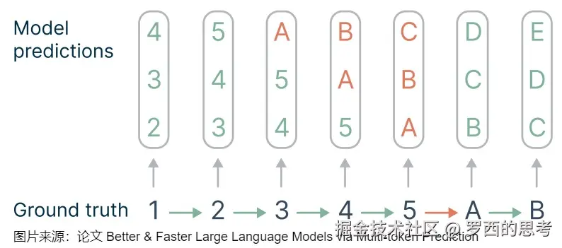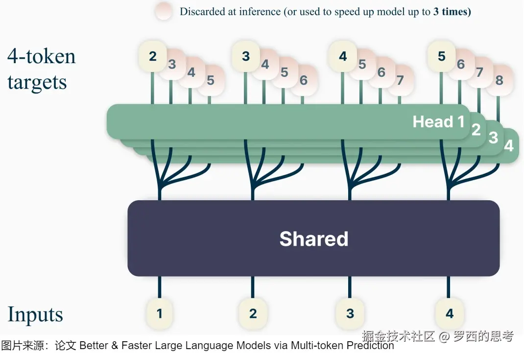 - 侧重训练时提高效率。比如论文“Better & Faster Large Language Models via Multi-token Prediction]”。具体而言,该方案通过一次生成多个后续token,可以一次学习多个位置的label,这样在训练时可以提供更丰富、更密集的训练信号,进而有效提升样本的利用效率,提升训练速度,同时也可以提升模型性能。Deep Seek MTP 也属于此类。