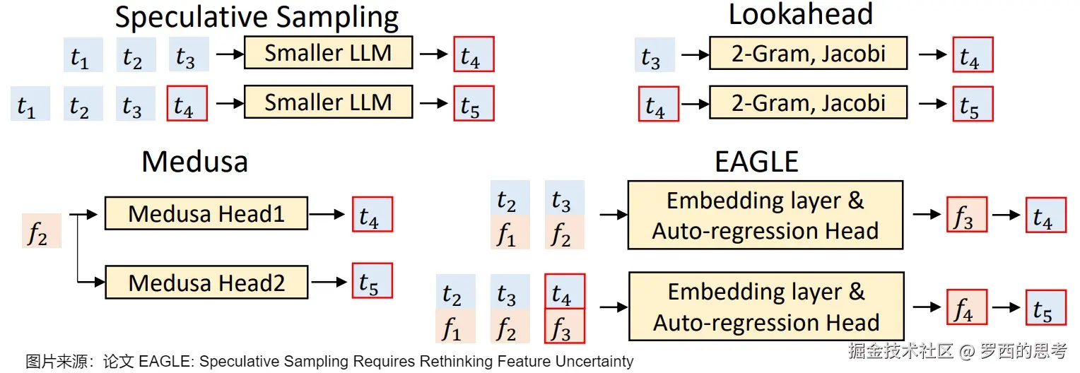 LLM 是逐个 token 生成文本的,即生成下一个 token 需要依赖前面已经生成的 token。这种串行的模式导致自回归编码过程计算量大、耗时,是LLM应用的主要瓶颈,因此有众多方案对其进行改进。EAGLE 论文中用下图把 EAGLE 和其它一些投机方案做了对比, 表示第 𝑖 次输入的 token, 表示 经过 LLM 后在倒数第二层的输出(即 LM Head 之前的输出)。我们就由此入手,看看其研究背景。