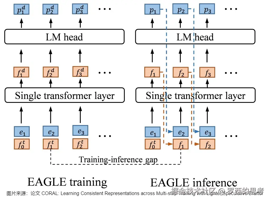 如果只约束输出token一致而不约束feature,在训练时只使用大模型的feature,但是推理时,小模型用的是自己上一个时间步的feature,该feature和大模型feature是有偏差的,在测试时很可能出现“虽然token预测对了,但是feature和大模型不一样”的情况,从而导致长距离的推理精度受到影响。具体可以参见下图:EAGLE使用目标模型的特征进行训练,而在推理中,草稿模型使用自己的特征。图上的f表示特征,e表示嵌入。上标表示变量的来源,t和d表示目标模型和草稿模型。下标用来索引特征或嵌入的位置。例如,表示位置2中来自目标模型的特征。 因此,后续其它研究人员都对此做出了改进,比如HASS和CORAL。HASS使用了Multi-step training让模型见过推理阶段的数据分布+增大数据量。
