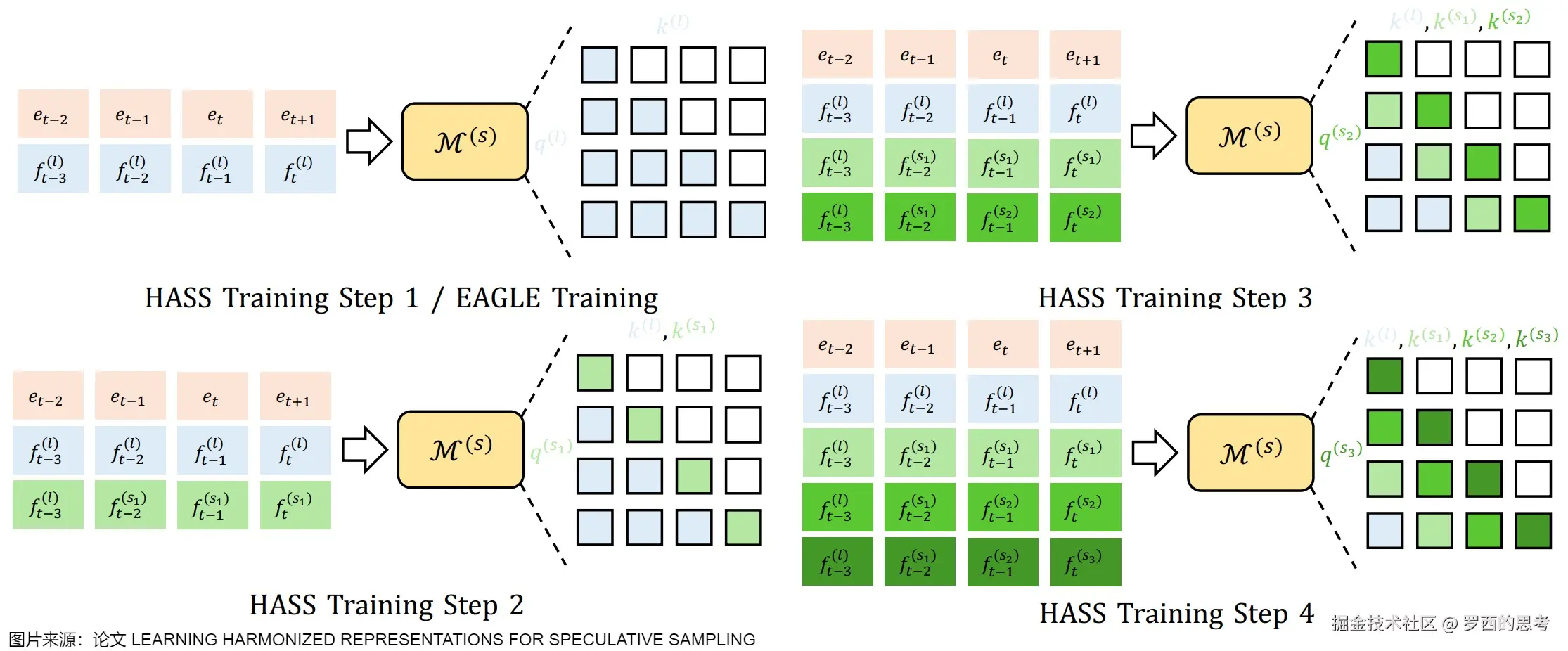 - 第二步利用了来自第一步的特征。在时间步 t+1 的自注意力机制中,使用来生成 query。key 和 value 由 生成,其中表示拼接操作, 表示早于时间步 t 的特征。注意力掩码被修改以确保看到的前一个特征始终是 ,如下图中的“HASS Training Step 2“所示。