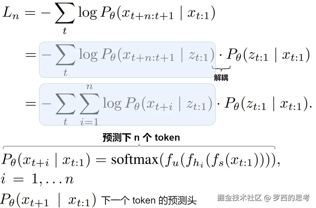 上述多词元预测的损失函数应该首先被分解为多个单词元(token)预测操作头,然后每个单词元(token)预测头会运行独立的 Softmax 来选择对应词元。