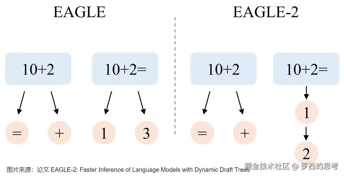 - 当上文是“10+2=”时,下一个token明显是“1”,但是EAGLE使用静态的草稿结构,仍然添加两个候选“1”和“3”,“10+2=3”不可能通过大语言模型的检查,存在浪费。EAGLE-2旨在解决这一问题,如下图右侧所示,当上文是“10+2=”时,EAGLE-2只增加一个候选token“1”,将节约出的token用于让草稿树更深,这样“10+2=12”可以通过大语言模型的检查,进而可以一次生成更多的token。