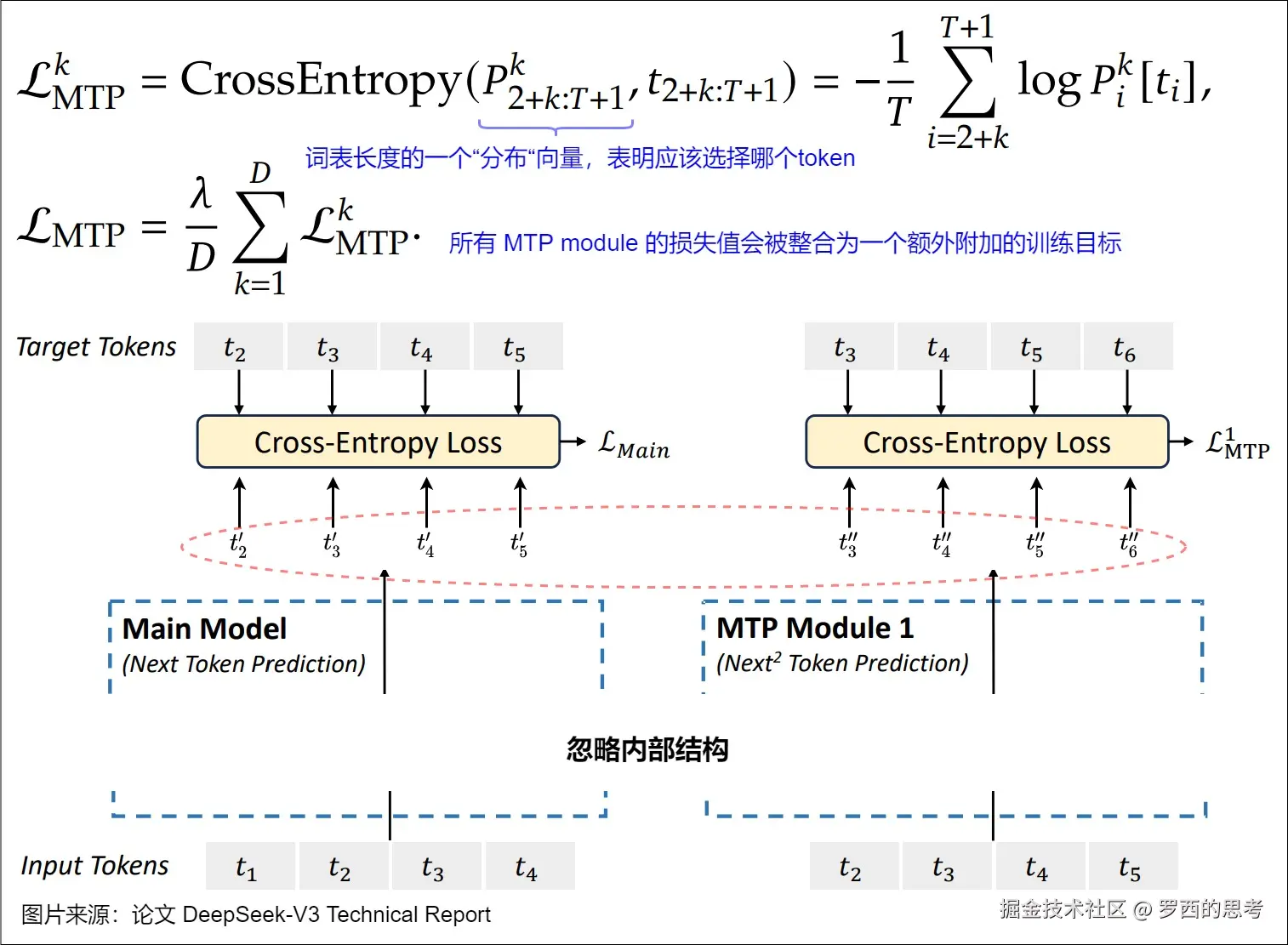 - 表示第 i 个位置的真实词元(ground-truth token),而 则是第 k 个 MTP module 对 的预测概率。