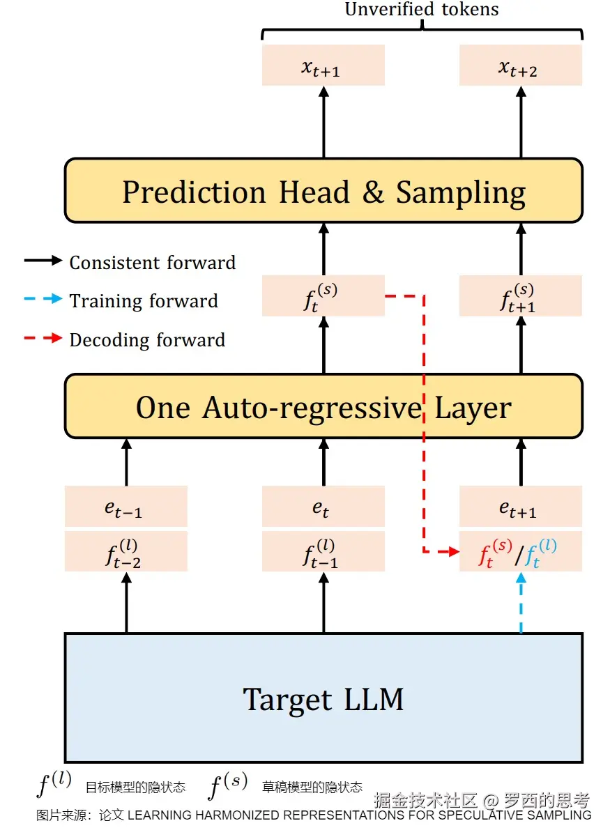 - 在特征层进行自回归。使用一个轻量级的自回归模型来预测目标 LLM 的特征序列,而不是直接预测 token。