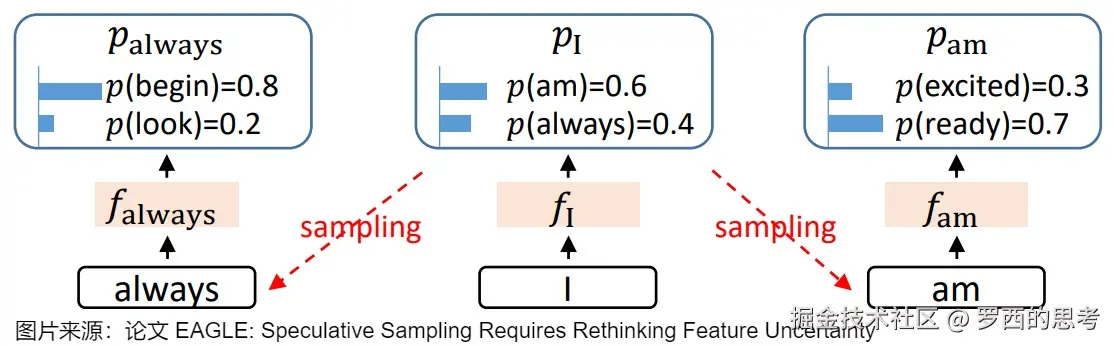 - 保留特征层可以更好的克服采样过程中的不确定性。通过引入前一个时间步的 token 序列来解决特征预测中的不确定性,这使得模型能够以最小的额外计算成本精确预测倒数第二层的特征。即,在预测当前特征时,不仅考虑之前的特征序列,还考虑之前已经采样的 token 序列。如上图,在输出 I 之后,会按概率采样输出 am 或是 always。在进一步寻找 always 的后续输出时,如果能保留 I 的特征层输出,就能保留住采样过程中丢掉的关于 am 的信息。