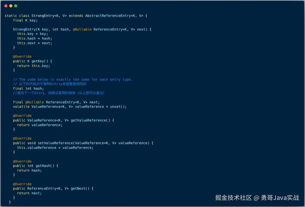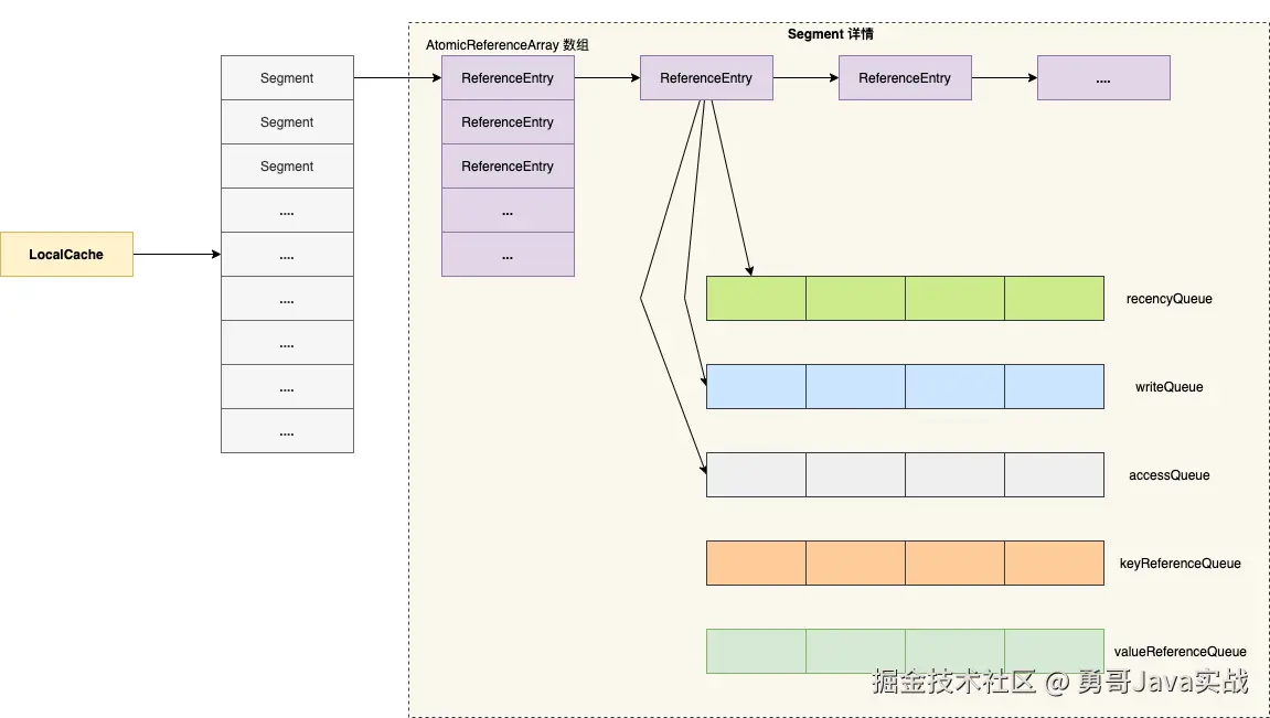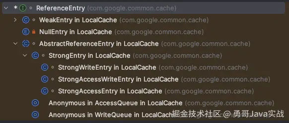 Guava Cache 使用 ReferenceEntry 来封装键值对,并且对于值来说,还额外实现了 ValueReference 引用对象来封装对应 Value 对象。
