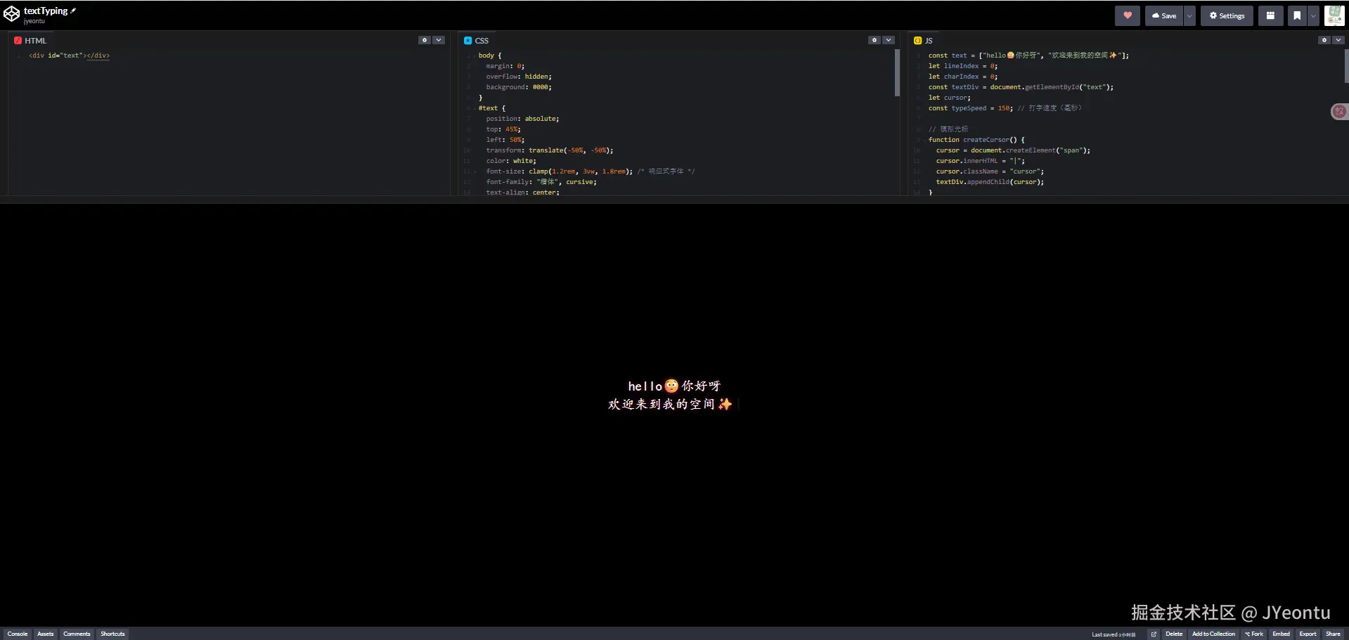 - 递归调用:通过 setTimeout 递归调用 typeText,实现逐个字符的延迟显示。