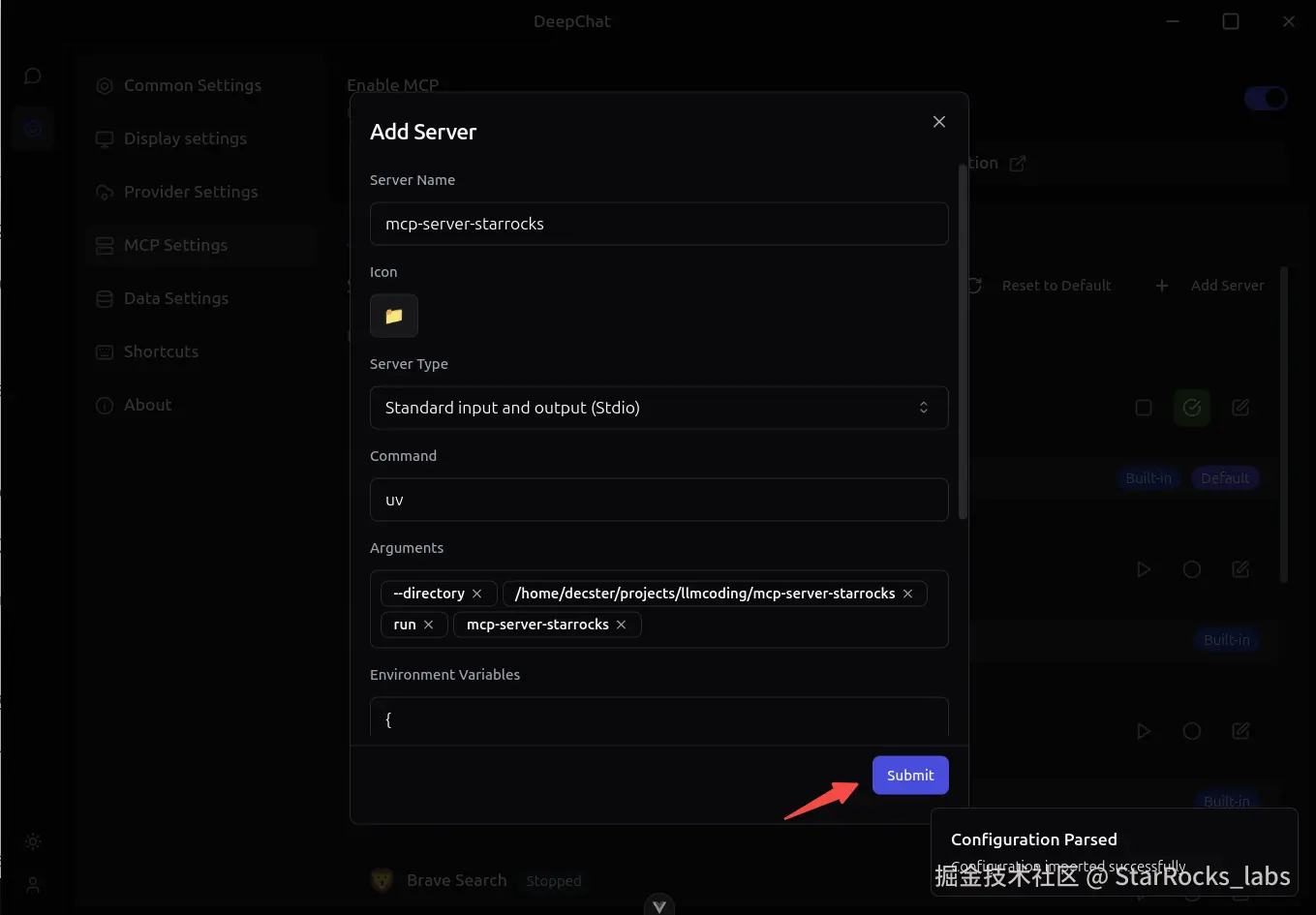 2.1 配置客户端添加 mcp-server-starrocks,客户端使用的是 DeepChat