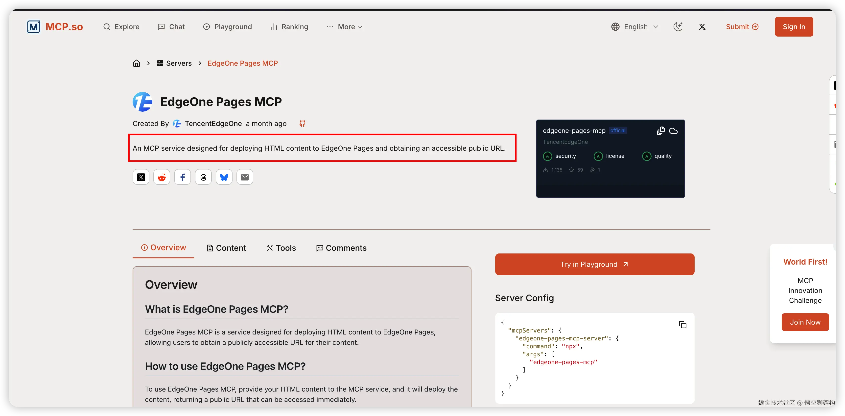 我们打开 MCP.so 网站中的关于 EdgeOne Pages MCP 的描述,如下图所示: