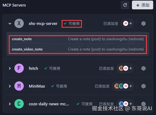 显示了与MCP Inspector中相同的工具列表,即create_note(用于发布图文笔记)和create_video_note(用于发布视频笔记)。