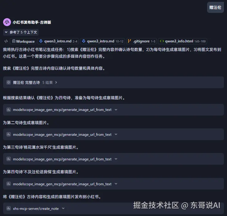 在前面的基础上,再提升一点难度,实现给定一首古诗,创建一首关于该故事的小红书笔记并发布,智能体创建示例如下: