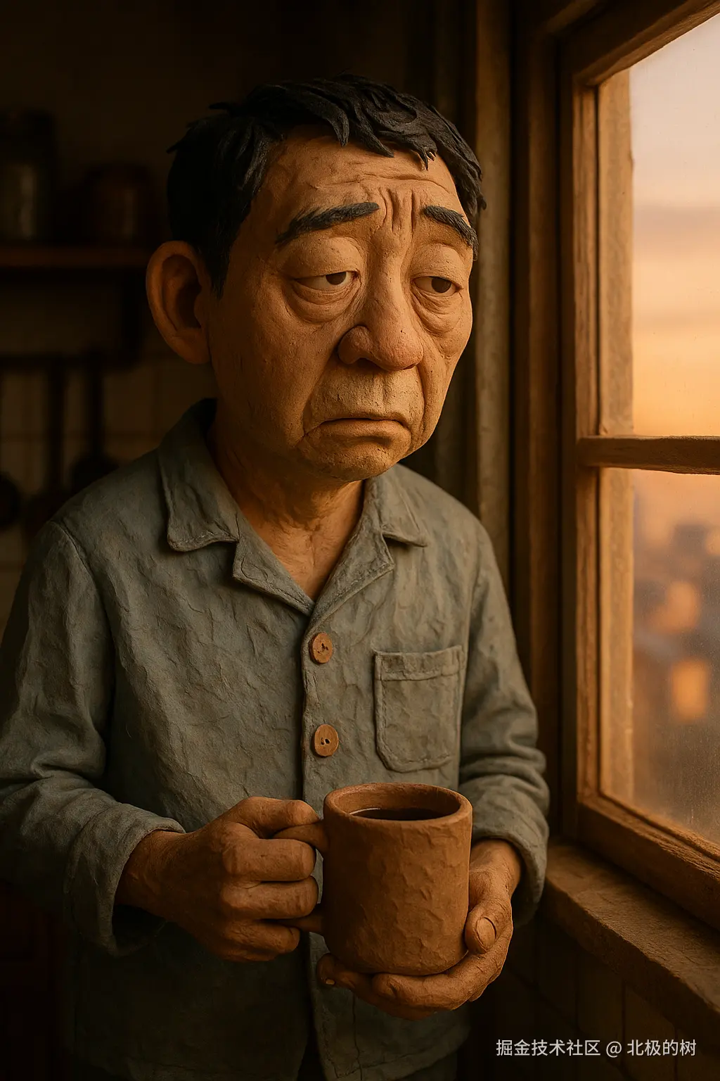 电影粘土动画场景:一位疲惫的中国中年男子,由精细的造型粘土制成,带有清晰可见的指纹和手工纹理,手持一个盛着咖啡的粘土杯,默默地站在窗边。他穿着一件褪色、布满褶皱的浅蓝色睡衣上衣,上面有几颗大小不一、造型粗糙的纽扣和一个前袋——其织物般的粘土纹理通过手工塑造的褶皱和磨损的边缘得到巧妙的强调。他的表情极度疲惫:半睁半闭的粘土眼睛黯淡无神,沉重的眼袋垂在眼眶下方,眉头紧锁,形成永久的愁容,嘴角因无声的顺从而下垂。他的目光凝视着窗外晨曦初露、泛着柔和橘色光晕的天际线,眼神略显呆滞,仿佛在远方寻找意义,或者仅仅是逃避眼前的单调。