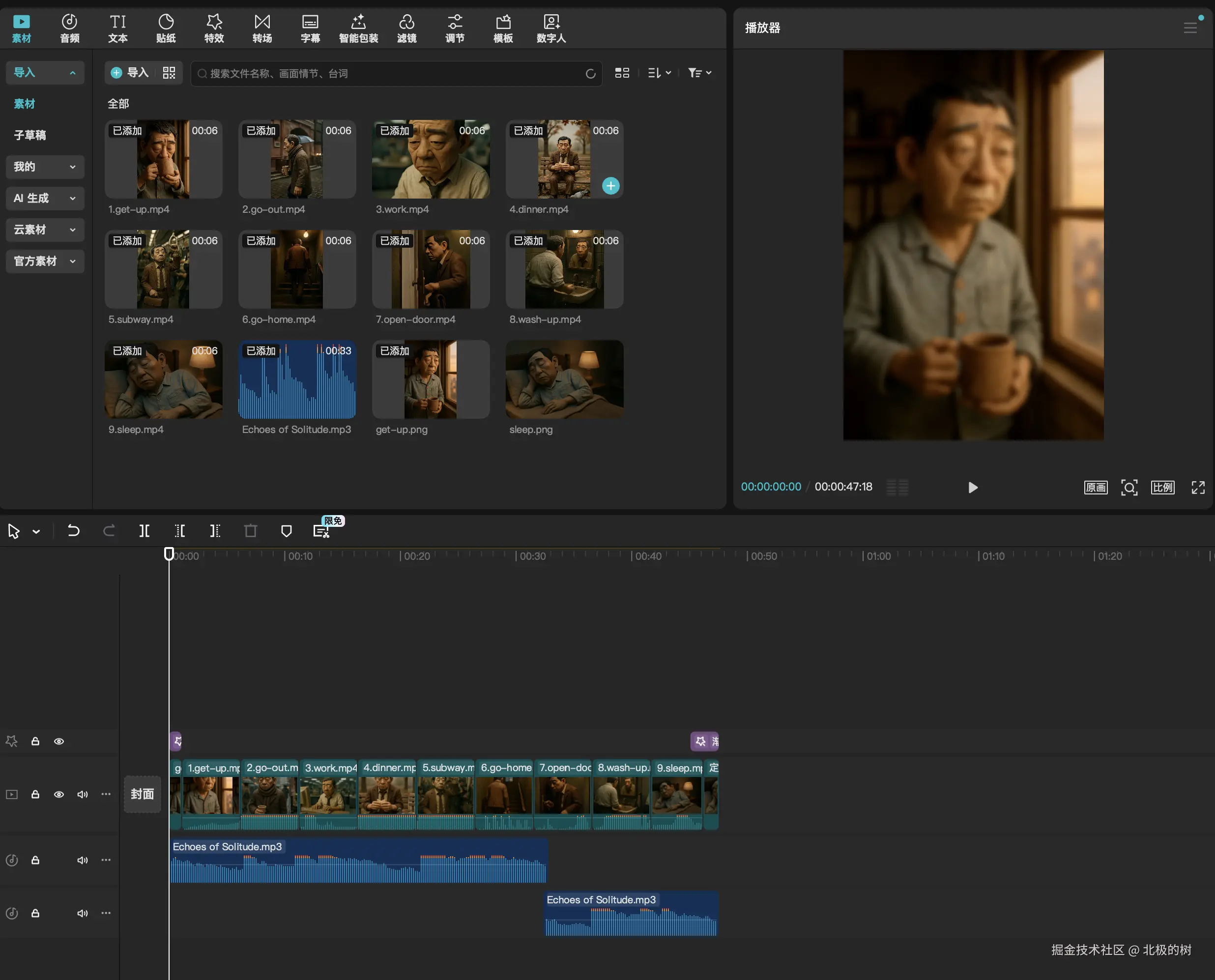 至此,我们手中已经“集齐”了所有的素材:一系列配有逼真环境音的独立视频片段,以及一段为整部影片量身定制、能够烘托情绪的背景音乐。接下来,就可以用目前最好用的音视频剪辑工具”剪映“将其剪辑成一个完整的影片。
