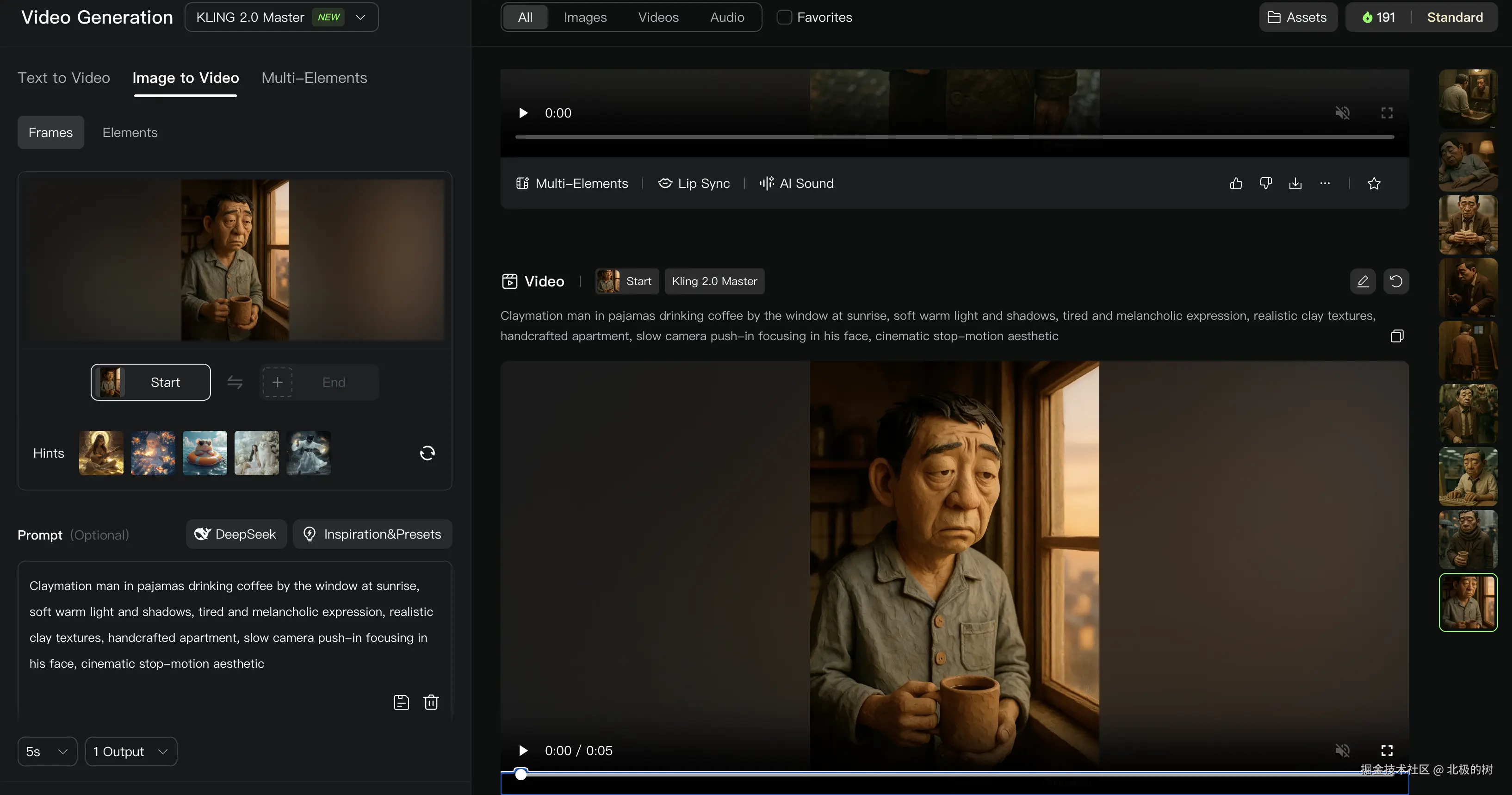 有了为Kling量身定制的视频描述,再结合上传的场景图,就可以在Kling中开始生成每个分镜的5秒视频片段了。