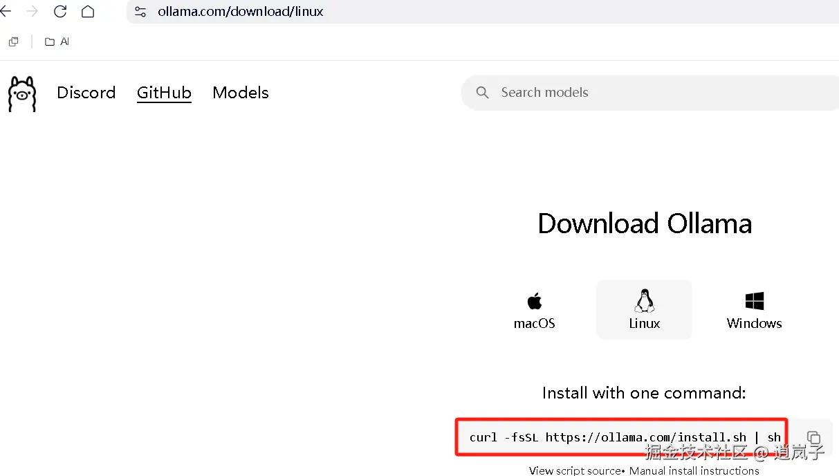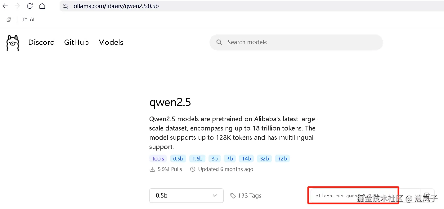 可从ollama官网 models模块搜索感兴的模块,复制红框中的命令,拉取运行模型
