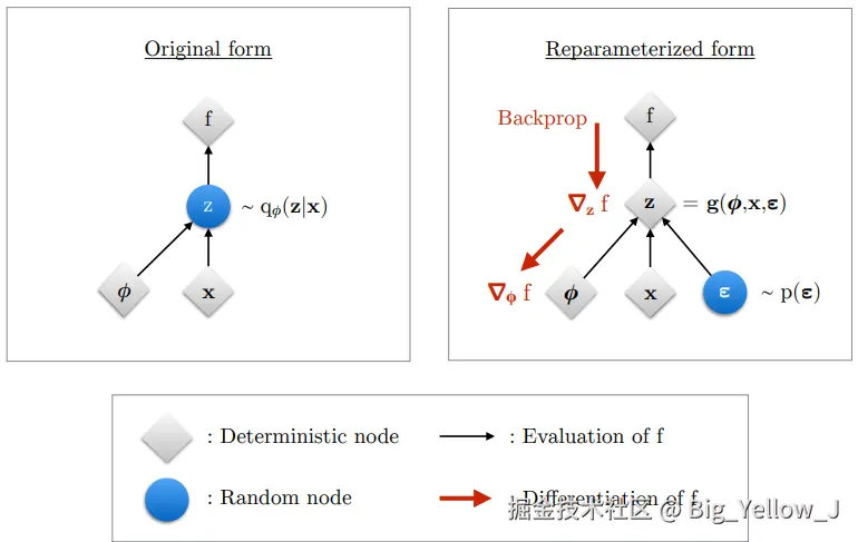 既然如此那么就直接涌入一个随机变量 ϵ \epsilon ϵ 将最开始的 z ∈ q φ ( z ∣ x ) z \in q_{\varphi}(z\vert x) z ∈ q φ ( z ∣ x ) 转化为:z = g ( ϵ , φ , x ) z=g(\epsilon,\varphi,x) z = g ( ϵ , φ , x ) ,回顾最开始定义的损失函数:
