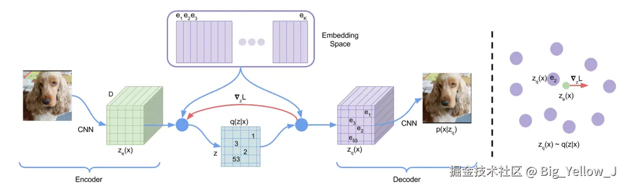 注意主要简单介绍一下其基本原理,VQ-VAE主要是为了解决VAE在生成样本模糊问题,通过向量量化将编码器的输出映射到离散的码本(codebook)中。这种离散化可以更好地捕捉数据的局部结构,生成更清晰的样本,同时避免了传统 VAE 中后验分布和先验分布之间的 KL 散度优化带来的不稳定性。因此和传统的VAE差异在于将 “潜在空间”替换为离散的 码本(codebook)