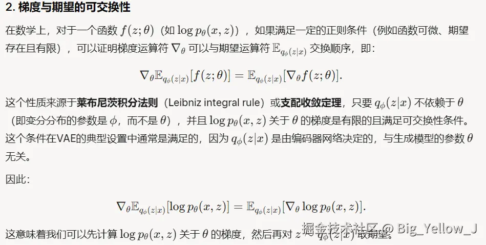 (1-2)也需要注意之所以可以将梯度拿到期望里面(直接借鉴 grok里面解释),另外一点在计算梯度时候将 KL散度拿掉这是因为在KL计算中第一部分参数为 φ \varphi φ ,而第二部分参数 p θ ( x ) p_\theta(x) p θ ( x ) 我们实现定义他是一个简单的标准正态分布:N ( 0 , I ) \mathcal{N}(0, I) N ( 0 , I )