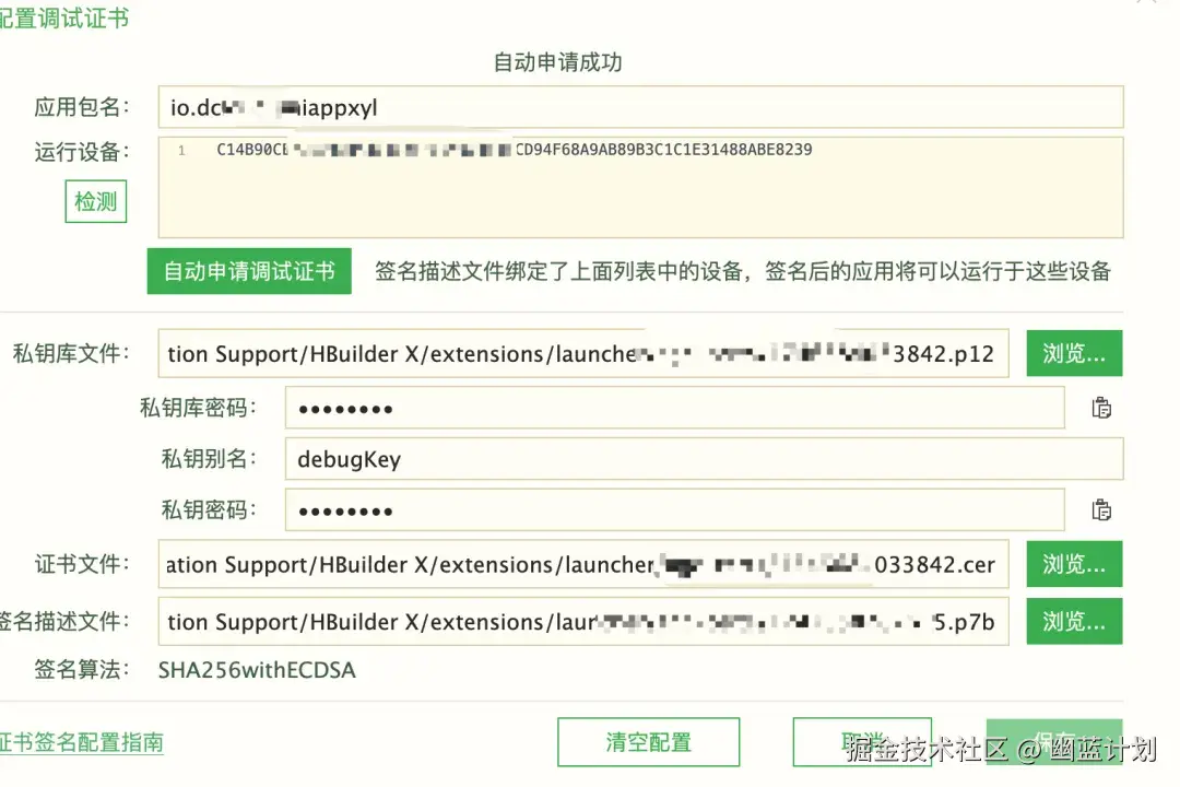 然后会看到设备列表,这时候选择底部的配置证书,在新的弹窗中将刚才创建应用的包名填写上,然后点击自动申请调试证书,待信息自动填满后,保存信息。
