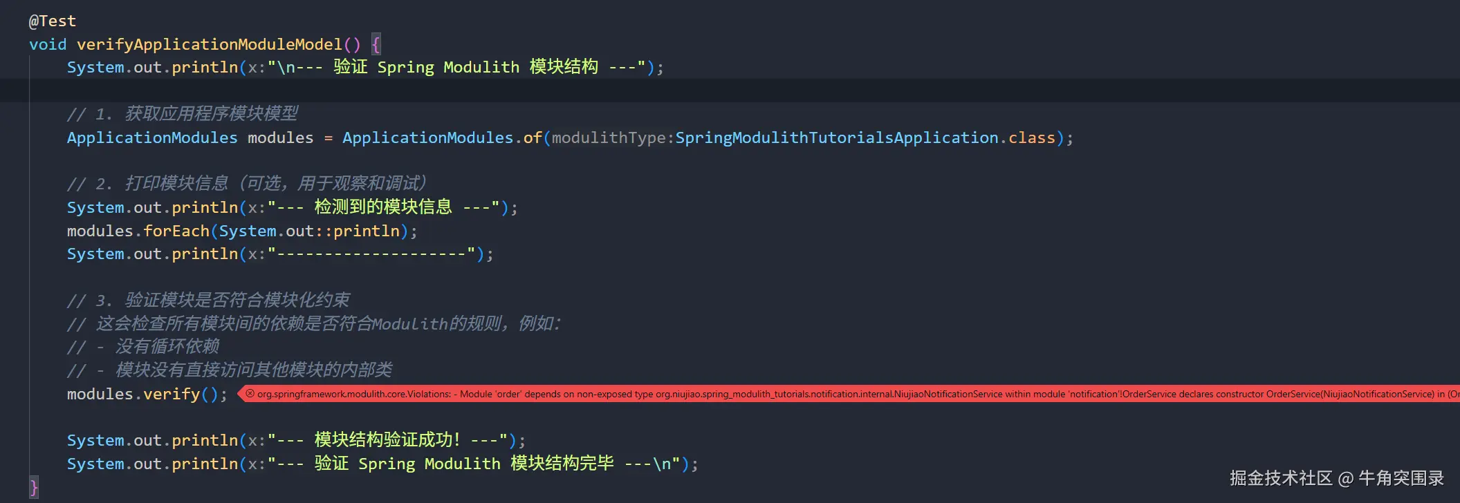// 这会检查所有模块间的依赖是否符合Modulith的规则,例如: