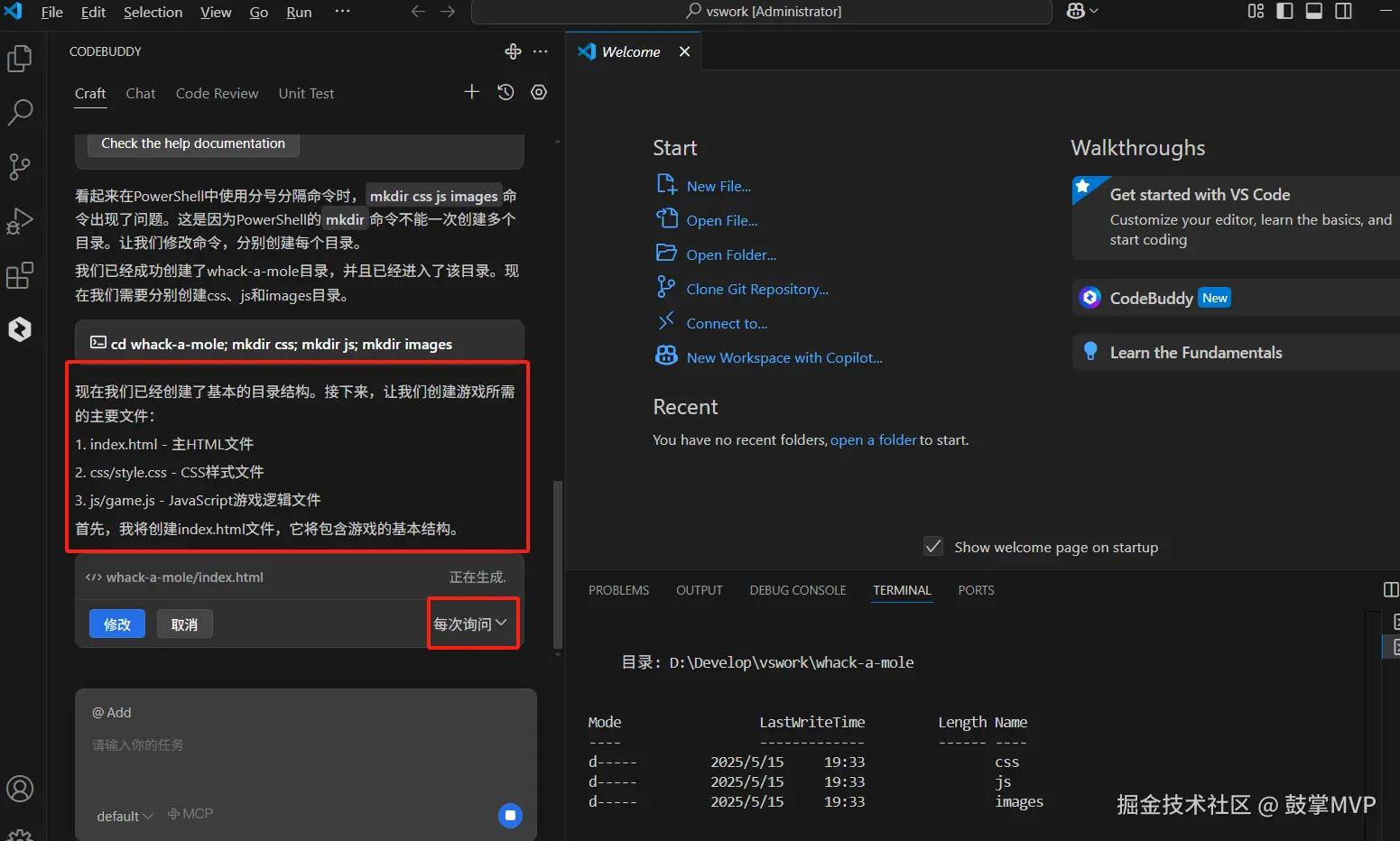 当我在VSCode中输入"创建打地鼠网页游戏"时,Craft的反应令人惊艳,我一开始仅仅把它当成了只会机械编写有限功能的傻瓜式工具,以为我会像使用其他工具一样向 CodeBuddy Craft 详细描述打地鼠游戏的需求:“要有一个清晰的游戏界面,上面显示时间、得分和生命值;游戏区域用网格展示地鼠洞,地鼠能在随机位置出现并保持一定时间;玩家点击地鼠得分,错点或超时则扣生命值;游戏结束后要能显示玩家分数,并提供重新开始的功能。......”