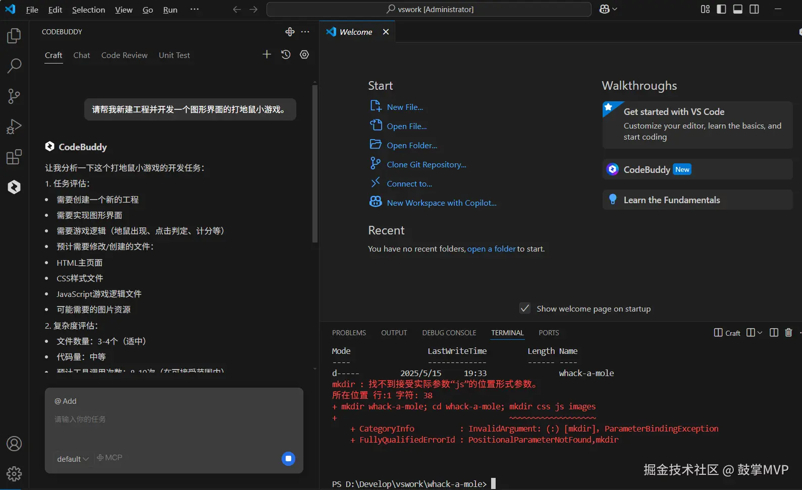 然而,一次偶然的机会让我见识了它的强悍,我决定让AI开发一个简单的打地鼠游戏。抱着试试看的心态,我决定使用 CodeBuddy Craft 来完成这个不起眼的小任务。