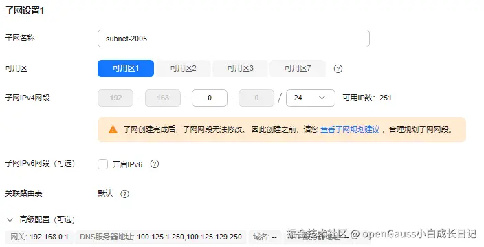 本示例中选择了单可用区,实际建议选择多可用区,以提高实例的高可用性。