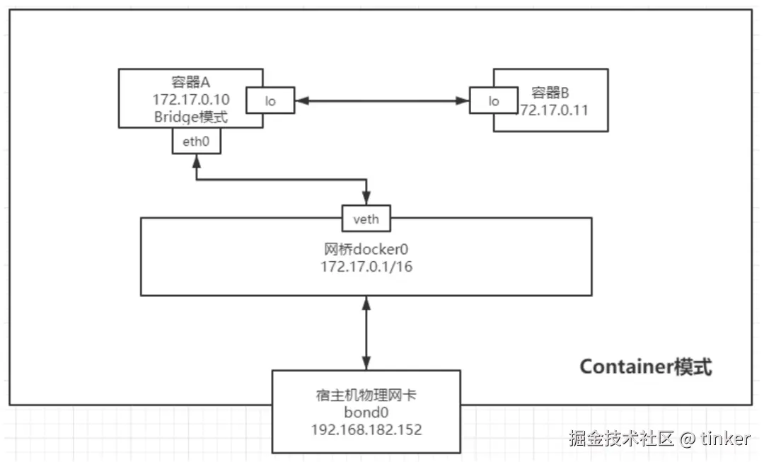 container模式和host模式很类似,host模式和宿主主机共享network namespace;container模式和指定的容器共享,两者之间除了网络共享(网卡、主机名、IP 地址),其他方面还是隔离的。