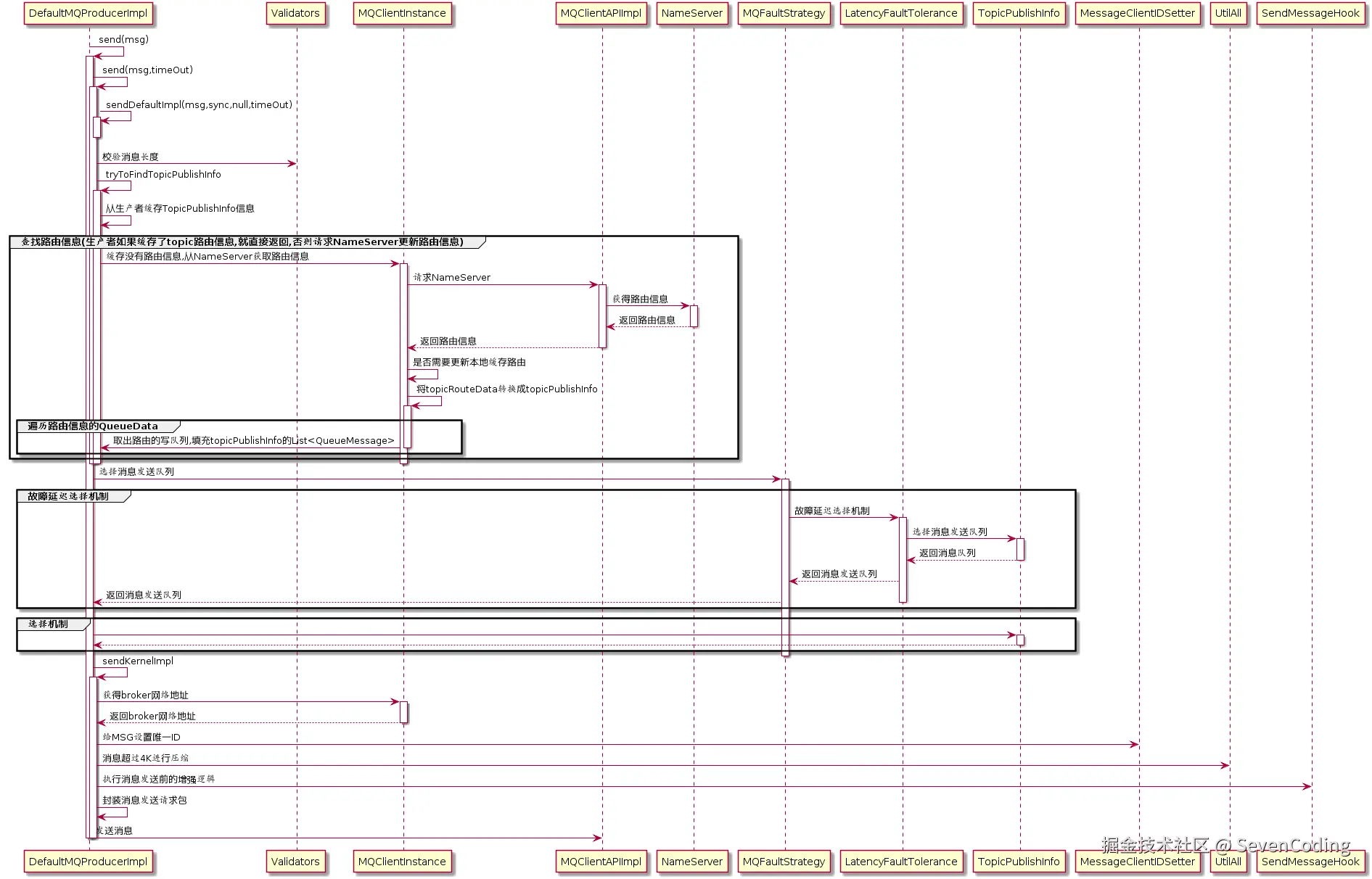 - 消息生产者(Producer)在发送消息时之前先从NameServer获取Broker服务器地址列表,然后根据负载均衡算法从列表中选择一台服务器进行发送。