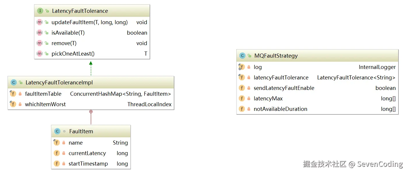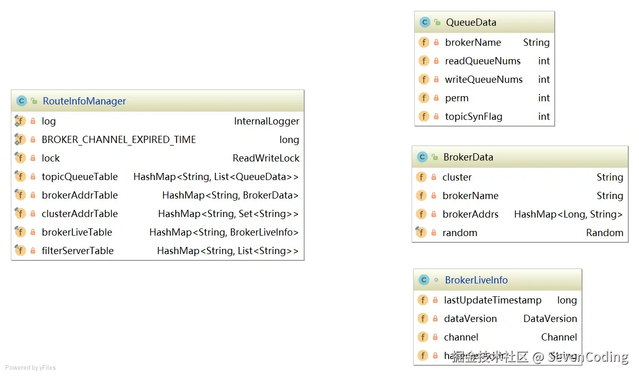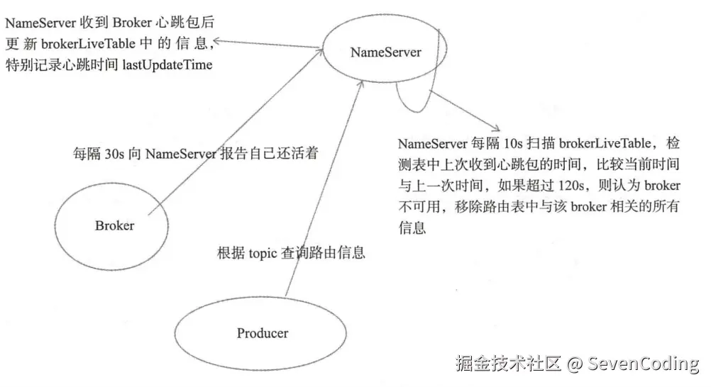 - NameServer与每台Broker保持长连接,并间隔30S检测Broker是否存活,如果检测到Broker宕机,则从路由注册表中删除。但是路由变化不会马上通知消息生产者。这样设计的目的是为了降低NameServer实现的复杂度,在消息发送端提供容错机制保证消息发送的可用性。