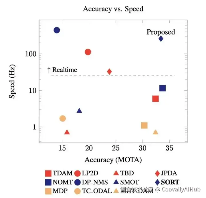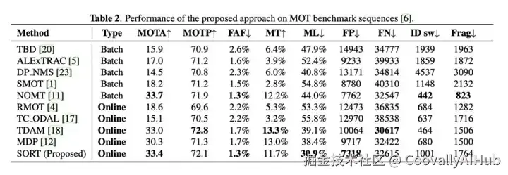 大多数MOT解决方案的目标是更高的精确度,但往往以牺牲运行性能为代价。虽然在离线处理任务中可以容忍运行时间过慢,但对于机器人和自动驾驶车辆来说,实时性能是至关重要的。图1显示了MOT基准中一些跟踪器的速度和精度。这表明,精度最高的方法往往也是速度最慢的(图 1 右下方)。相反,速度最快的方法往往准确度较低(图1左上角)。SORT结合了速度和精度这两种理想特性,却没有典型的缺点(图1右上角)。跟踪组件在英特尔i7 2.5GHz 单核上以 260 Hz 的频率运行,内存为 16 GB。