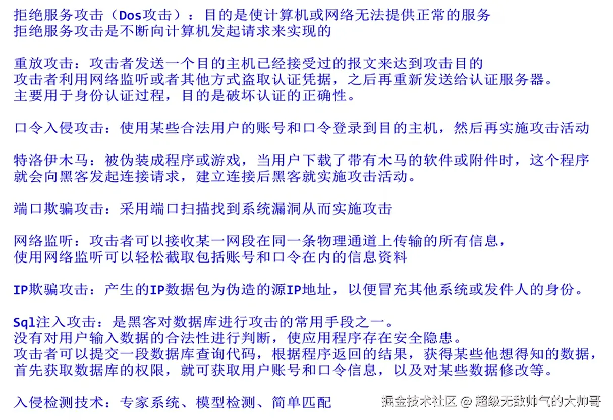 - 主动攻击包括拒绝服务(DoS)攻击、分布式拒绝服务(DDoS)攻击、信息篡改、资源使用、欺骗、伪装、重放等;被动攻击包括嗅探、信息收集等攻击方法。