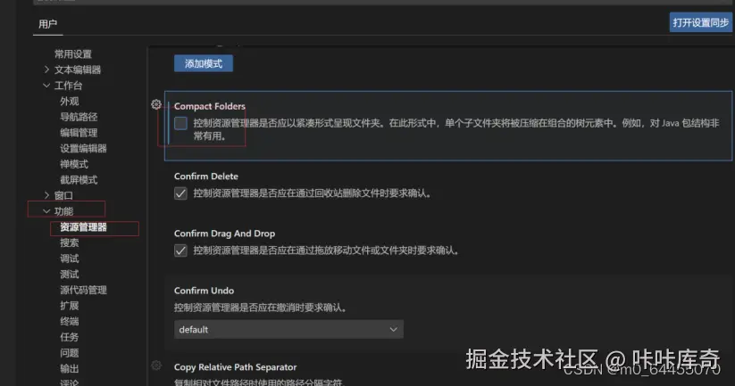 文件==》首选项==》设置==》功能==》资源管理器