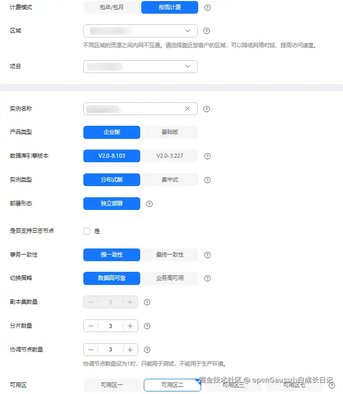 参考图6,配置实例名称,选择计费模式、产品类型、数据库引擎版本、实例类型、事务一致性、分片数量、协调节点数量和可用区。
