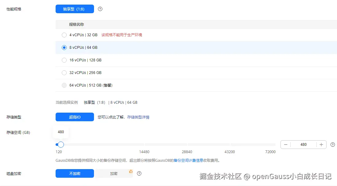 本示例中选择磁盘不加密,选择加密后会提高数据安全性,但对数据库读写性能有少量影响,实际请按照业务使用策略进行选择。