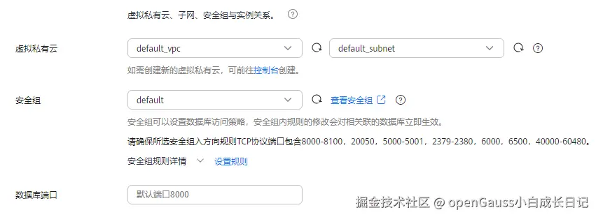 选择实例所属的VPC(创建VPC)和安全组(创建安全组),配置数据库端口。