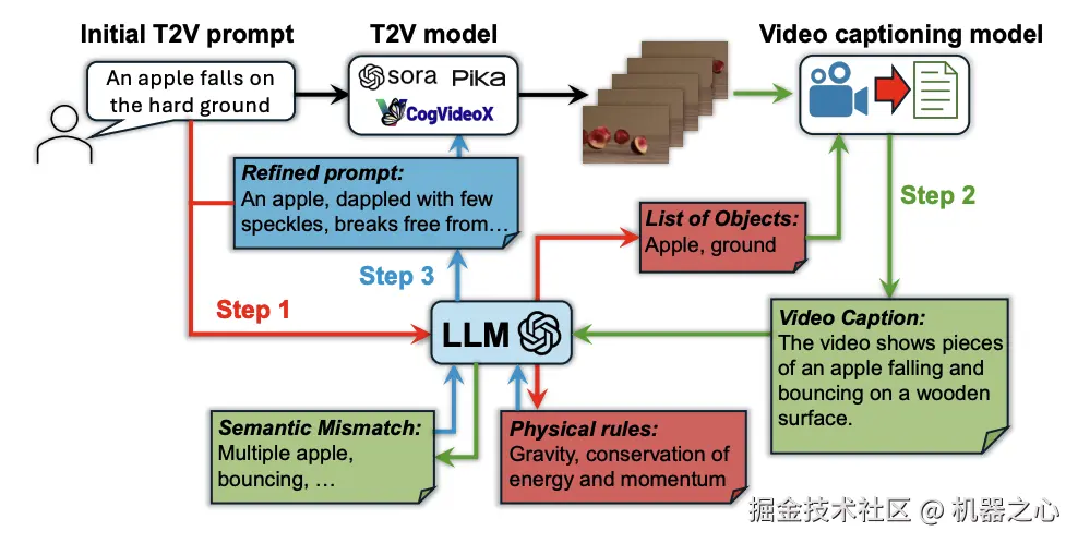 为了避免模糊不清的提示工程,PhyT2V 的核心思想是在 T2V 提示过程中启用思维链(Chain-of-Thought,CoT)和回溯推理(step-back reasoning)。通过应用分步指导和迭代自修正,确保 T2V 模型遵循正确的物理动态和帧间一致性。