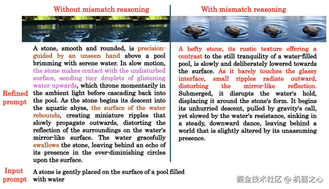 首先,使用视频字幕模型(例如 Tarsier)将生成的视频的语义内容转换为文本。然后,LLM 使用 CoT 推理评估视频字幕与当前 T2V 提示之间的不匹配之处。使用视频字幕是因为 CoT 方法更适合处理单模态数据,它强调线性分解和分步推理。通过将视频内容转化为文本,可以在文本域中进行 CoT 和回溯推理。消融研究证实此步骤对于识别和纠正视频中与期望不符的细节至关重要。