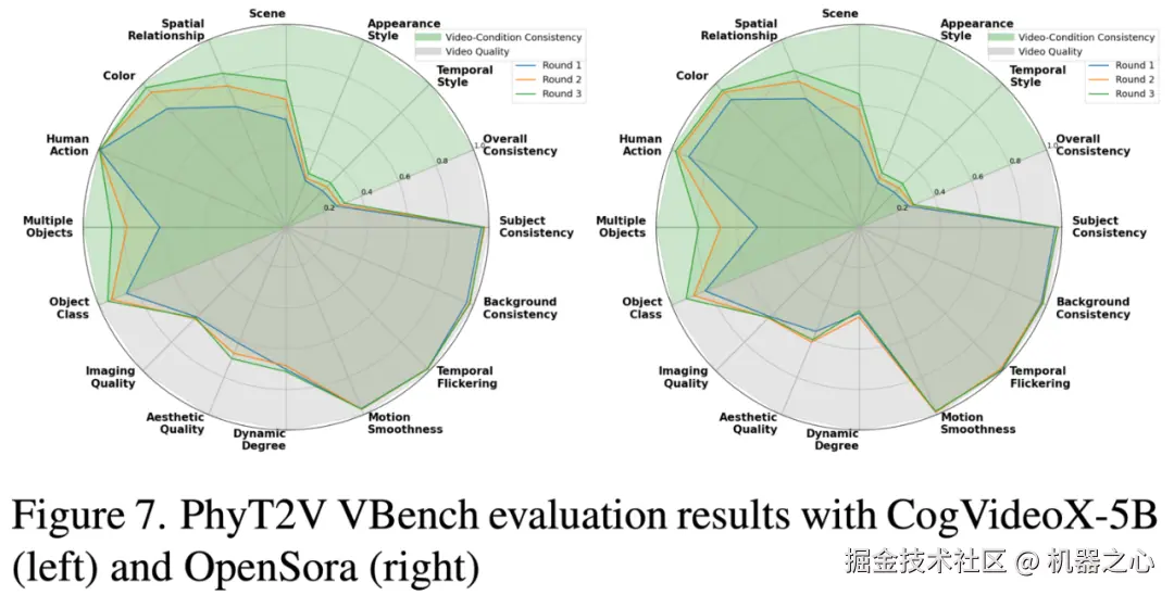 研究人员在多个基于 Diffusion Transformer 的开源 T2V 模型上应用了 PhyT2V,包括 CogVideoX 2B & 5B、OpenSora 和 VideoCrafter。