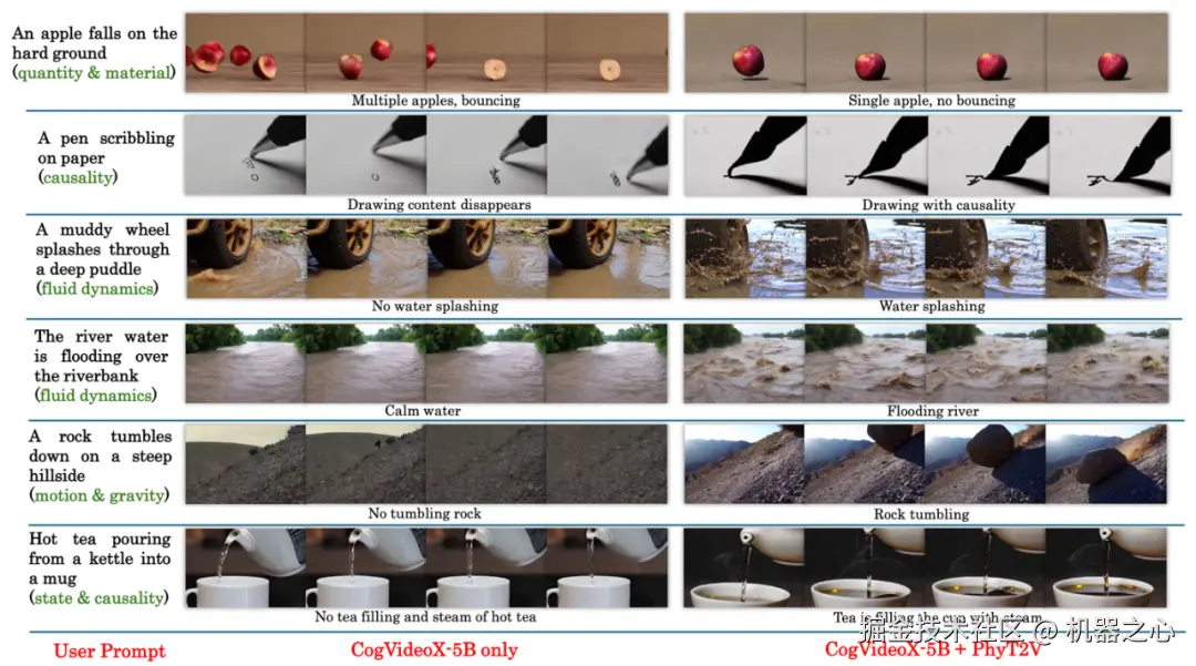 然而,尽管单帧视频质量很高,当前的 T2V 模型在遵守现实世界常识和物理规则方面存在显著不足。例如,它们可能无法正确处理物体的数量、材质特性、流体动力学、重力、运动、碰撞和因果关系。