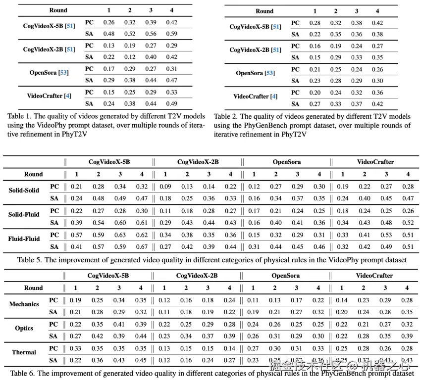 这种改进在 CogVideoX-5B 模型上最为显著,PC 提高可达 2.2 倍,SA 提高可达 2.3 倍。在其他模型上也有显著提升。迭代修正过程收敛速度快,通常 3-4 轮足够。