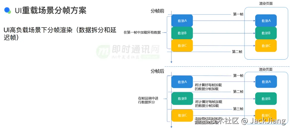 **在处理 UI 重载场景时,我们采用了一种称为分帧方案的方法。**分帧这个术语的含义是,当应用在一帧内无法完成所有绘制工作,或者在多帧内都无法完成时,会导致屏幕卡顿现象。尽管用户可以看到画面,但却无法进行滑动或操作。在这种情况下,分帧方案就显得尤为合适。虽然分帧方案可能看起来不是最优雅的解决办法,但它确实能够有效地解决性能问题,使应用性能达到预期标准。分帧方案虽然看似是一种应急措施,但它能够帮助应用性能达标。
