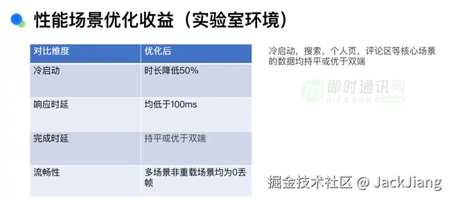 在对性能场景进行优化后,我们可以看到显著的收益。在实验室环境下的测试显示,冷启动时间可以降低 50%,响应时延可以低于 100 毫秒,完成时延则保持与双端持平或更优。在流畅性方面,在多场景和重载场景下均实现了 0 丢帧的成果。需要注意的是,这里的测试是在非重载模式下进行的,即没有同时运行多个资源密集型应用,如《王者荣耀》或《和平精英》等。在这种条件下,我们的核心场景,如冷启动、搜索和个人页等,都能够与双端完全对齐。