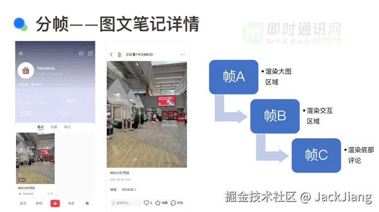 **在小红书的图文笔记场景中,分帧方案得到了应用。**当用户在首页的双列场景中点击一篇笔记进入笔记详情页时,这个过程涉及到许多组件的加载。我们可以将这些组件拆分成不同的帧,例如帧 a、帧 b 和帧 c。对于用户而言,他们通常希望在第一时间看到整个大屏的画面,因此我们会优先在帧 a 中展示大图。而在帧 b 和帧 c 中,我们再处理顶部导航栏或底部交互区等内容。通过这种分帧策略,我们能够确保用户在第一时间看到最关键的内容,同时避免了因为一次性加载过多组件而导致的性能问题。
