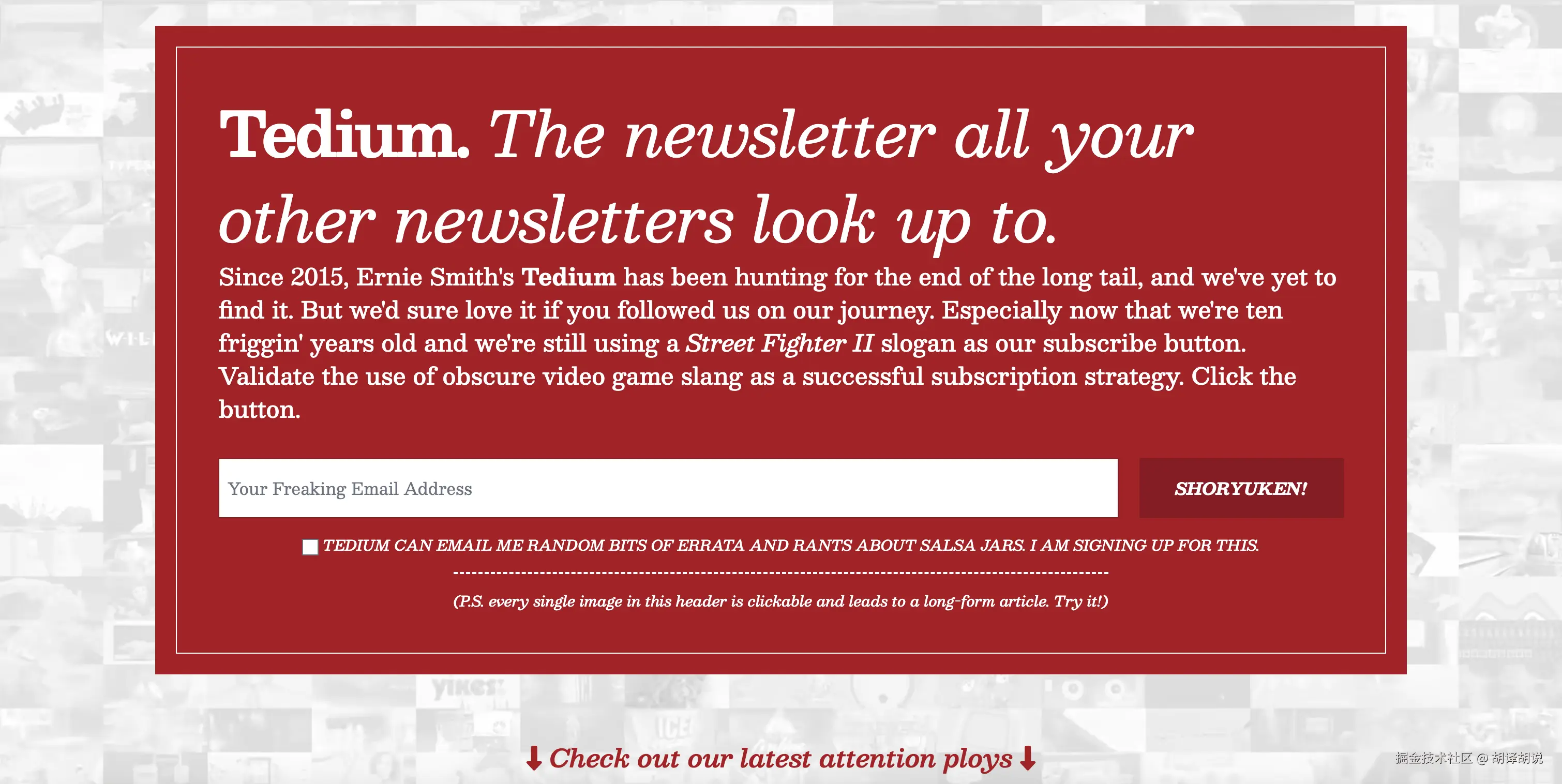 在今天这个什么都讲求转化率、A/B 测试、按钮颜色要“心理学”指导的世界里,Tedium 把街霸里的招式写在订阅按钮上,简直像是在说:“我们只想吸引真正懂我们的人。”