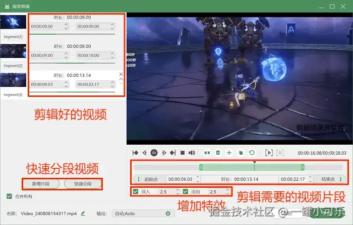 步骤3:录制完毕后,可以在预览页面预览录制好的视频,还可以选择下方的 “高级剪辑” 工具,对视频进行剪辑,比如快速分段视频、增加视频特效等。