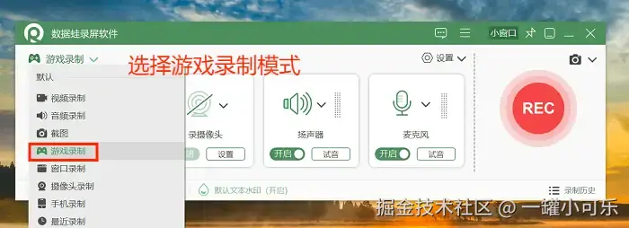 步骤1:下载并安装软件后,打开软件可以看到左上角可以选择录制模式,本文选择 “游戏录制” 模式。